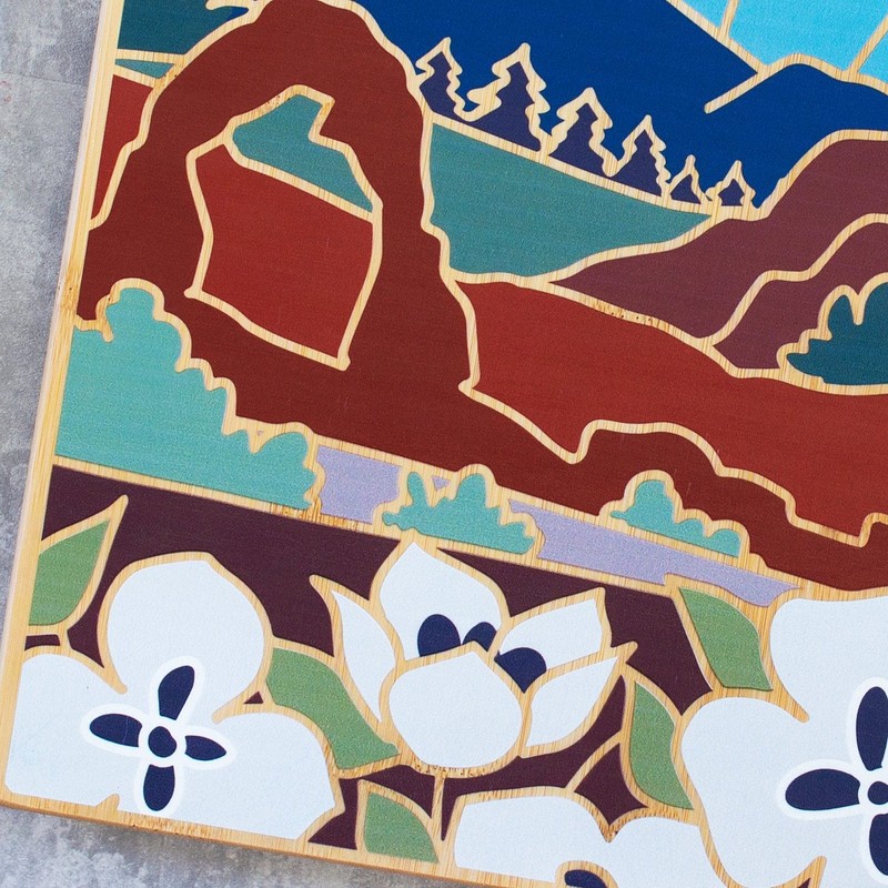 Totally Bamboo Utah State Shaped Cutting Board and Charcuterie Serving Platter with Artwork by Summer Stokes, Includes Hang Tie for Wall Display Varies