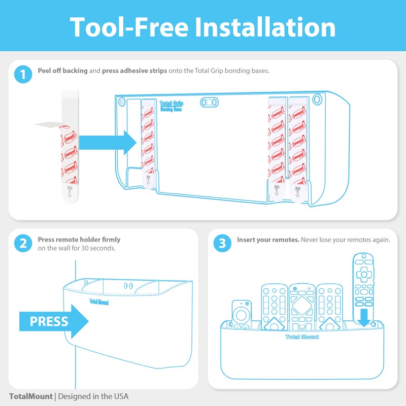 - EASY TO INSTALL without any tools and without drilling holes in your wall. This patented remote control holder enables long-term remote storage, yet the special adhesive is easily removable by pulling the tabs. (Screws are also included but are not recommended.)