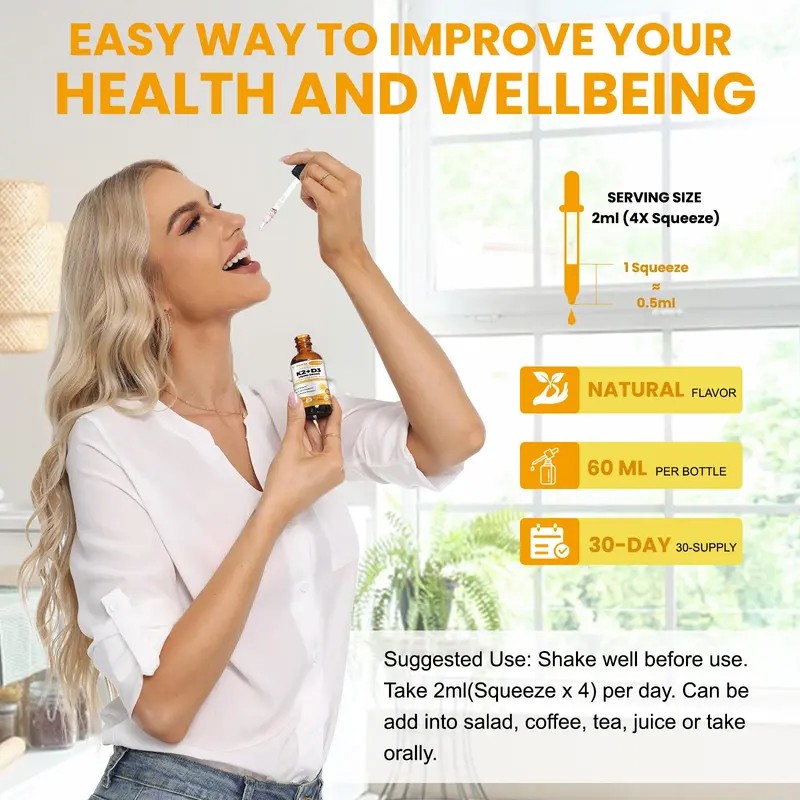 Totaria Liposomal Liquid Vitamin D3 K2 Drops provide highly absorbable support for bone strength, immune health, and calcium metabolism. Each serving delivers 5000 IU of Vitamin D3 and 200 mcg of Vitamin K2, enhanced with MCT oil and Omega-3 for optimal absorption and effectiveness. This advanced formula works synergistically to direct calcium to the bones and teeth while helping prevent buildup in arteries. With added support from magnesium and zinc, it offers a comprehensive solution for bone density, heart health, and immune function. Non-GMO and made in the USA, these drops are ideal for daily use and suitable for adults of all ages. The convenient liquid format allows for flexible dosing with high bioavailability.