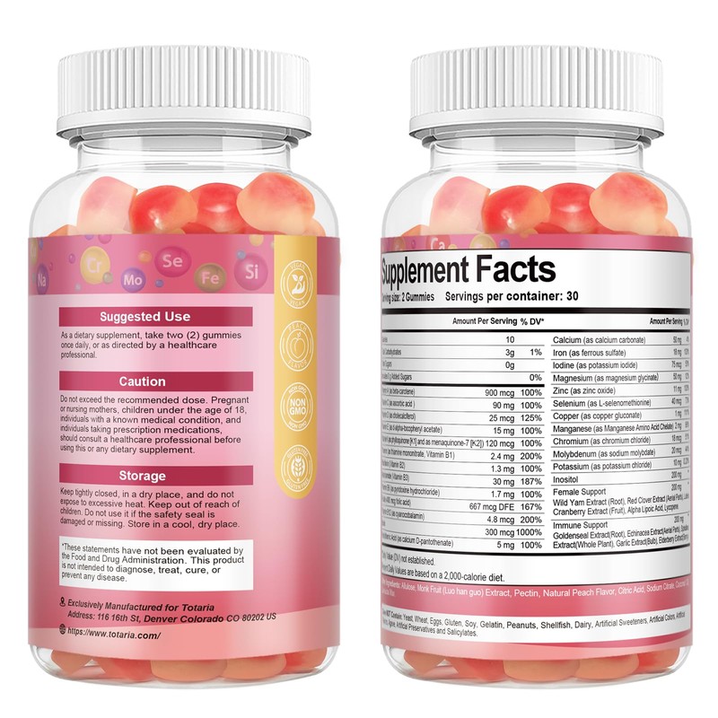 - Essential Minerals for Overall Health: Key minerals such as Calcium, Iron, Magnesium, Zinc, Chromium, Molybdenum, and Potassium are included. These minerals contribute to bone health and immune support. Suitable for Women, ages 14+. Whether you are a 40+, 50+ women, you can feel confident with your health from Totaria multivitamin gummies.