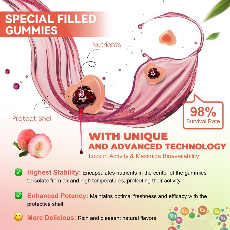 - Upgraded Filled Multivitamin Gummies with Iron: Totaria multivitamin filled gummies is a special form of gummies. Compared to traditional gummies, Totaria women multivitamin filled gummies are packed with central nutrients that lock in activity and stability, giving you the highest bioavailability and absorption.