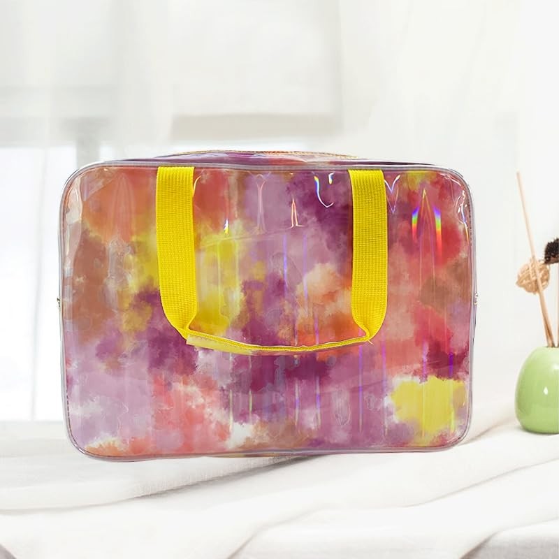 - Transparent Design: This clear bag showcases a vibrant tie-dye pattern in shades of blue and green, reminiscent of fluffy clouds.