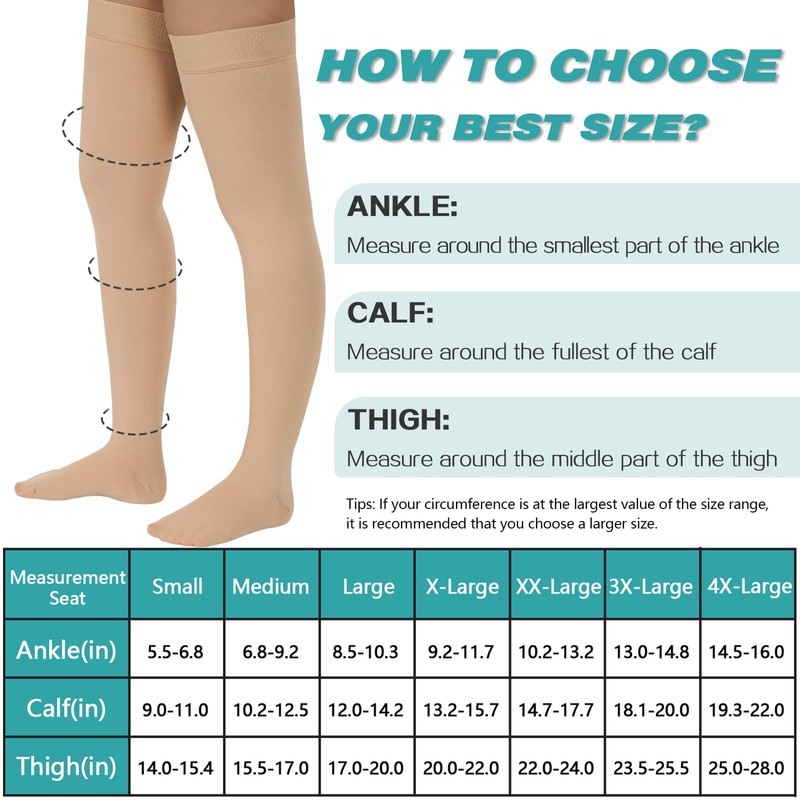 - ⭐SATISFACTORY SERVICE: Your health and comfort is our principle! Please measure your leg circumference accurately before you place an order. This can greatly reduce the probability of you purchasing an inappropriate size. If you meet any problems with the thigh compression socks, please contact us at any time, we will definitely help you solve problems as soon as possible.