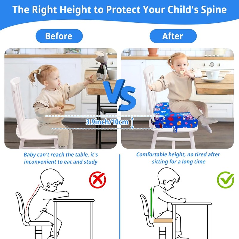【Praktisch und Tragbar】Die kinder sitzerhöhung stuhl kann nicht nur zu Hause beim Essen, Malen und Spielen verwendet werden, sondern kann auch auf Reisen, beim Essen, beim Camping, am Strand und an anderen öffentlichen Orten mitgenommen werden.(Hinweis: Da das Produkt vakuumverpackt ist, müssen Sie es vor dem Gebrauch 24-48 Stunden ruhen lassen, damit es sich auf seine ursprüngliche Höhe ausdehnen kann)