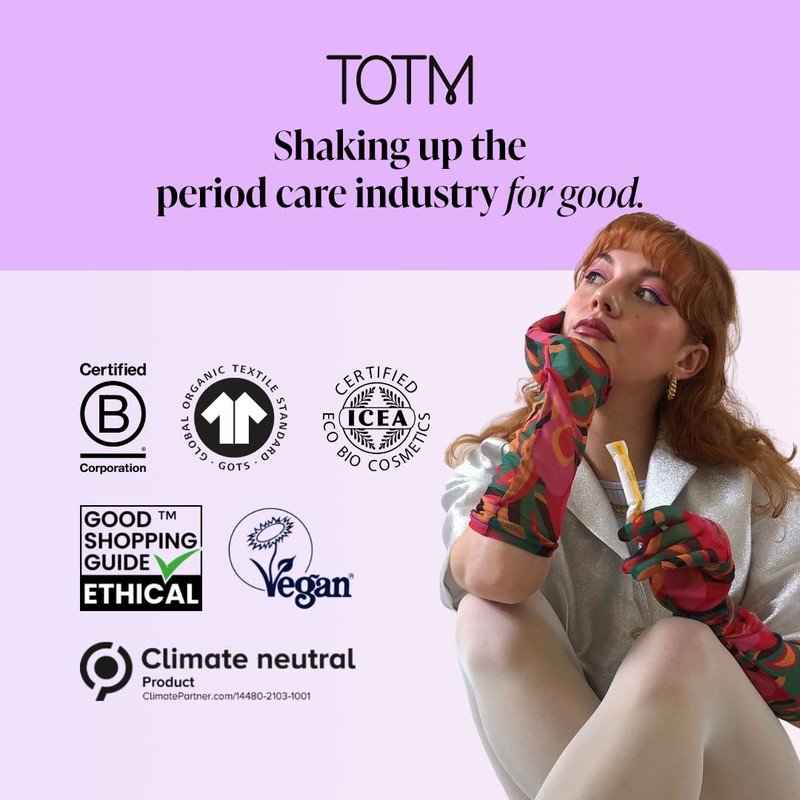 TOTM Organic Cotton Regular Applicator Tampons – suitable for light to medium flow (6-9g). Reduce plastic waste on your period with these naturally absorbent tampons made from certified organic cotton. Designed to offer superior comfort and protection without damaging the planet. Known for its soft, breathable fibres, we use ethically sourced organic cotton from the core to veil in our tampons. Each tampon comes with a cardboard, biodegradable applicator which features a twist-to- release. Our organic cotton range is made in Europe and carbon neutral.