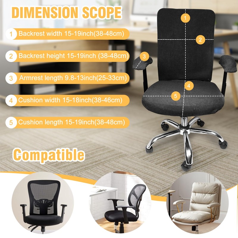 4-Piece Office Chair Cover Set Includes stretchable seat/back covers & 2 armrest pads. Fits most office/computer/gaming chairs. Protects from scratches, dust, pet hair. 85% polyester+15% spandex, anti-slip silicone. Tool-free install, machine washable. Measure chair: seat14.96–18.9 inches (W/L), back 14.9–18.8 inches (W/H) for best fit.