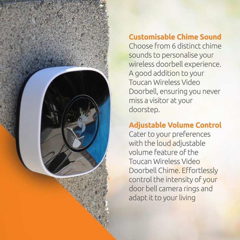 Customisable Chime Sounds This product allows you to customise your notification system to fit any setting. With 6 different chime sounds and a loud adjustable volume, you can be sure that you will never miss a visitor. Whether you need a subtle indoor ring or a louder outdoor alert, you can ensure that you are always aware of visitors. This versatility makes the product incredibly useful for anyone who needs to be notified of someone's arrival. Durable Design You'll benefit from the durability of this product, this ensures that it can be used for an extended period of time, making it a good choice for busy households that need a reliable doorbell chime. With its long-term use, you won't have to worry about sudden breakdowns or malfunctions. Easy Setup Installing this doorbell chime requires no wiring or complicated setup, making it ideal for those who wish to install it quickly and easily. Powered by just two AA batteries, it is a 100% wire-free solution. The simple pairing process with the Toucan video doorbell makes it even more convenient, eliminating the need for complex setup. This makes it an ideal choice for those who want to install a doorbell chime with minimal fuss, allowing you to enjoy the convenience of a doorbell chime without the hassle of complicated installation. -6 distinct chime sounds -Adjustable volume for personalised experience -Quick and easy connection to Toucan video doorbell -No wires required - easy installation