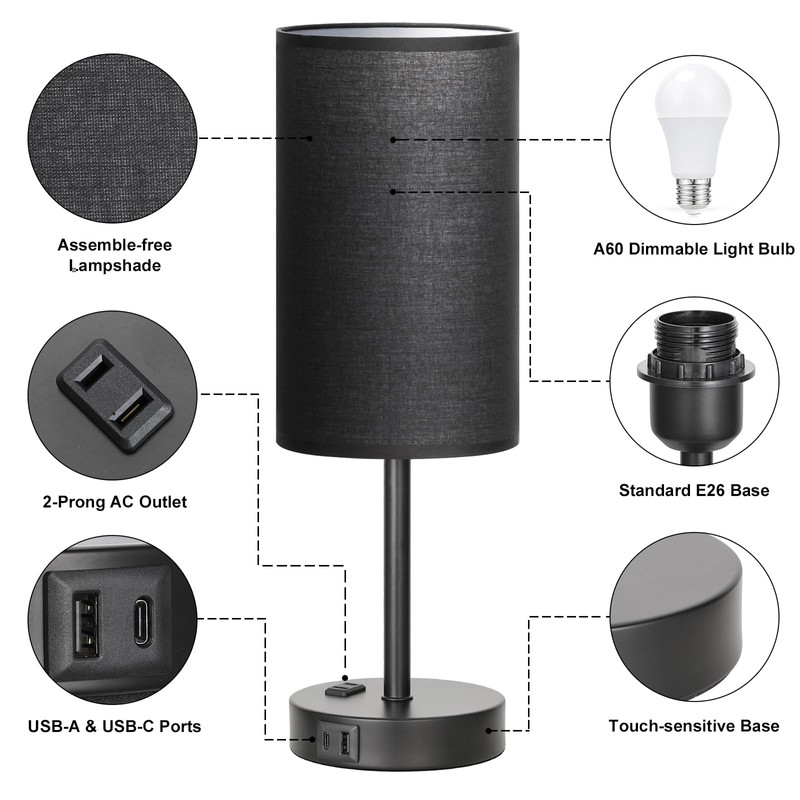 - 3. USB & USB-C Charging Ports and Outlet - Power 3 devices at once bedside lamp! With a usb-c port (5V/2.1A) and a usb-a port (5V/2.1A) and a outlet (120v) on the lamp for fast charging, getting your phones, pad, laptops, humidifier, kindle, headsets, speaker, earbuds and other electronics fully charged all from a single table lamp no matter if it is on or off. You'll love how easy it is to get to your device when you need it. Gone are the days of running to the nearest power outlet.