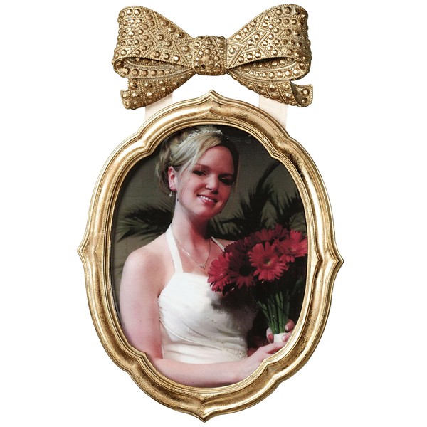 • The Bow Wall Photo Frame is a charming and unique way to display a treasured photograph. Resin picture frame is finished in gold. A beaded bow topper attaches to the frame by ribbons. Small, 7.5"x11", holds your 5"x7" photo. Large, 10"x15", holds your 8"x10" photo. Specify Small (for 5"x7") or Large (for 8"x10") Displays your photograph in decorative fashion Glass protects your photo Wall photo holder is embellished with a beaded bow accent Search X991-003 for these frames finished in