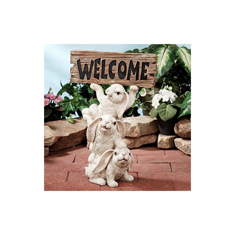 - There is nothing like a trio of raucous rabbits to offer a hearty Bunnies Welcome to your visitors. This indoor/outdoor bunny sculpture is made of polystone with an aged white finish. The smiling bunny at the top holds a welcome sign. Do not expose accent to freezing temperatures. Bunny sculpture measures 10"Wx5"Dx14.5"H. Cute welcome accent for your home, entryway, or garden Bunny sculpture depicts three playful rabbits For indoor or outdoor seasonal display.