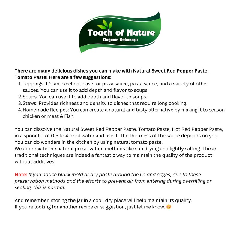 Touch Of Nature Homemade Turkish Tomato Paste — Pure, 100% Natural, No Additives, Authentic Rich Flavor Hatay/Turkiye Flavor (13.23oz) Paste Without Additives, Bursting with Flavor and Nutrients,