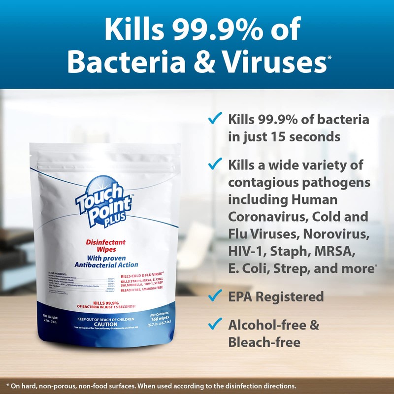 - POWERFUL GERM-KILLING FORMULA: Touch Point Plus disinfecting wipes kill 99.9% of bacteria in just 15 seconds, including the SARS-CoV-2 virus, the cause of COVID-19 on hard, non-porous, non-food surfaces. Touch Point Plus also kills up to 45 pathogens, including Human Coronavirus, Cold and Flu Viruses, Norovirus, HIV-1, Staph, MRSA, E. Coli, and Strep. This fast-acting formula starts cleaning on contact.