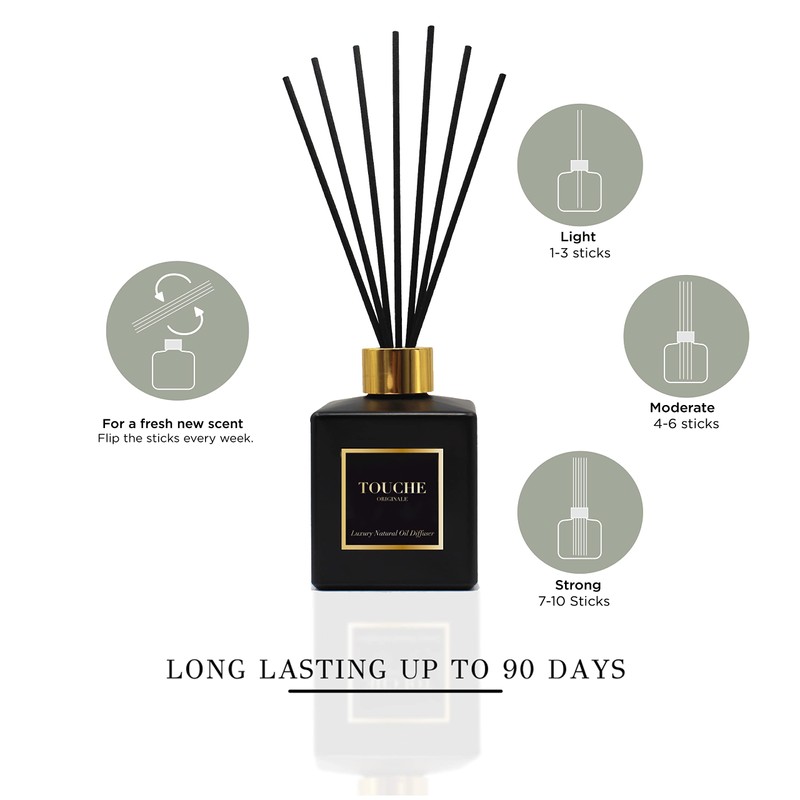 Touche Luxury Natural Reed Diffuser. Long Lasting Scented Home Fragrance. Natural Essential Oil Alcohol-Free. 4.75 OZ. Glass Bottle (Citrus - Black Bottle)