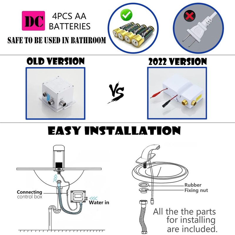 - Battery Powered Convenience: Our faucet's control box is powered by 4 AA batteries. Battery replacement process is simple, and usually replacing the battery once can ensure the stable operation of the faucet for 6-8 months. (Batteries not included in the package)