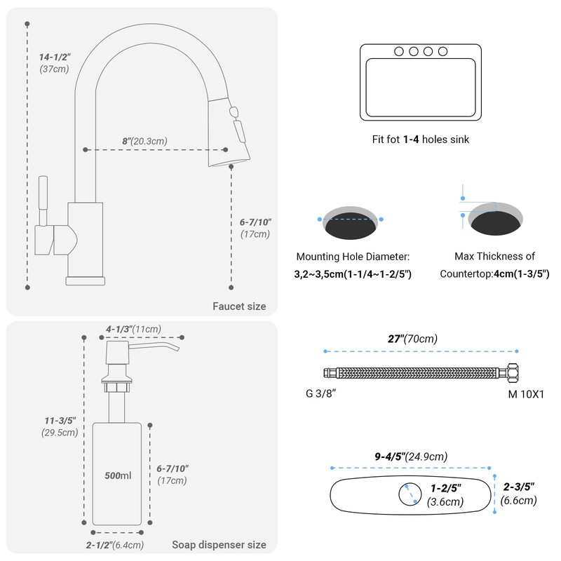 - Minutes to Install : The mounting hole is 1.25-1.4’’, max thickness of countertop is 1.6’’. Package include : BLYLUND touchless kitchen faucet, battery box (warm tip: 4AA 15V alkaline batteries are not included) soap dispenser, deck plate, user manual and warm tip paper and all the necessary nuts, . All your need is together in the box and saves your precious time just follow the manual.