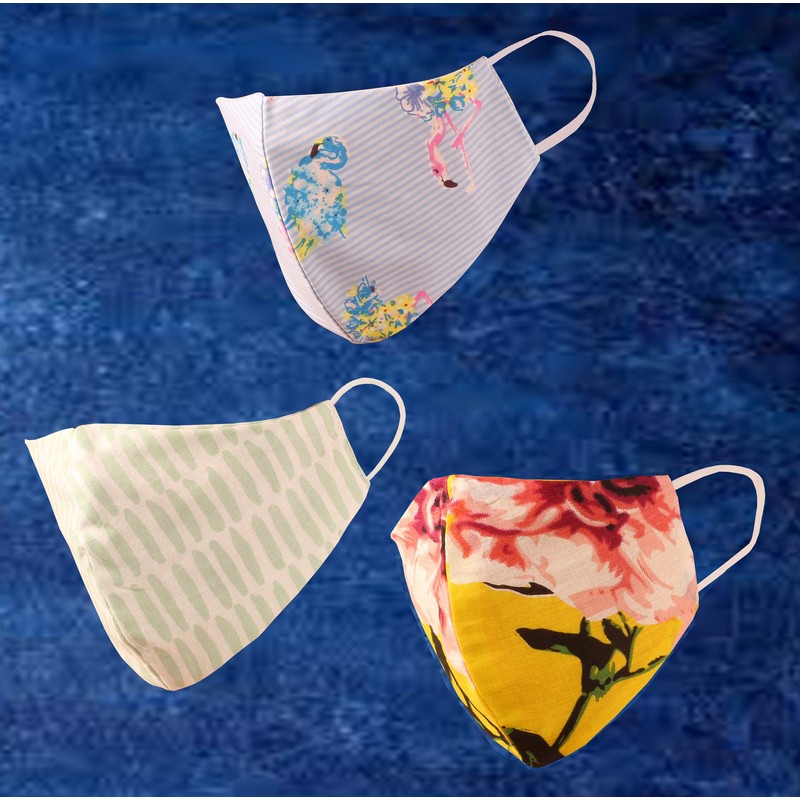 • Pack of 3 Classic Modern Floral Cup Style Fine Cotton Face Masks Lightweight cotton fabric is breathable, especially suitable for summer. Mask 1- Pale Green Dash Mask 2- Blue Floral Print Mask 3- Vibrant Floral Print in Yellow and Pink