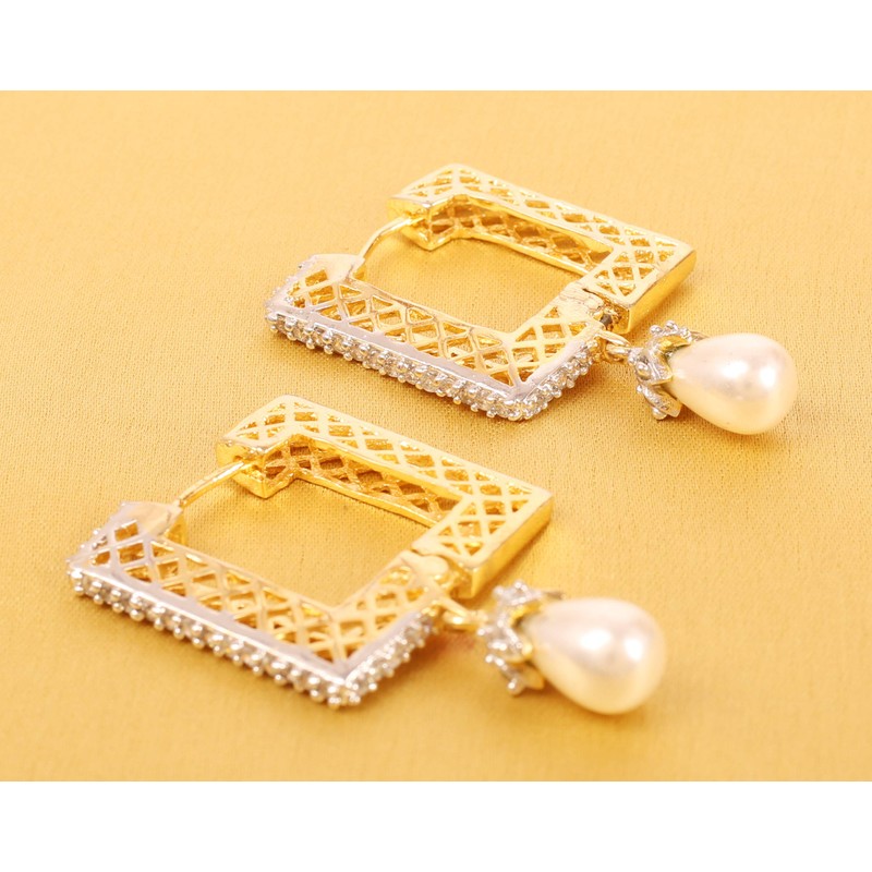Touchstone Gold And White Tone Plated Simulated Diamond Faux Pearls Cubic Zirconia Cz Classical Wire Work Pretty Frame Flaunting Dangle Earrings For Women Designer Jewelry.