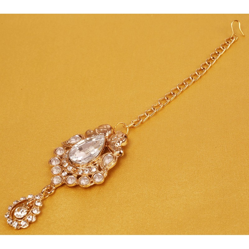 - NEW! Touchstone Indian Bollywood Traditional Paisley Floral Kundan Polki Diamond Look Designer Jewelry Mangtika Head Accessory In Antique Gold Tone For Women. SPECIFICATIONS: Mangtika: Mangtika Weight 10 Gms. Length: 6 Inches. Inches. This is in a special dark gold plating to recreate the look of antique jewelry. Long lasting Plating with Lacquer finish. Made of Long lasting Alloy Metal, pretty laser cutting and textured color. Hand finished.