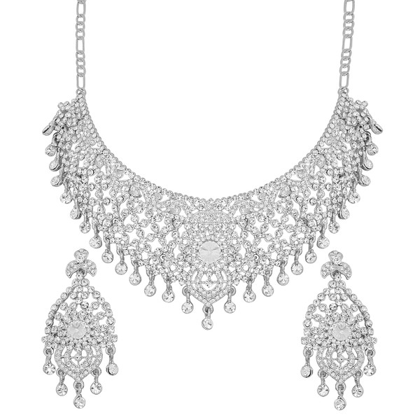Touchstone Indian Hollywood Masterly Created Sparkling Fashion Handcrafted Filigree White Rhinestone Studded Look Designer Jewelry Grand Bridal Hassle Necklace Set In White Tone For Women.