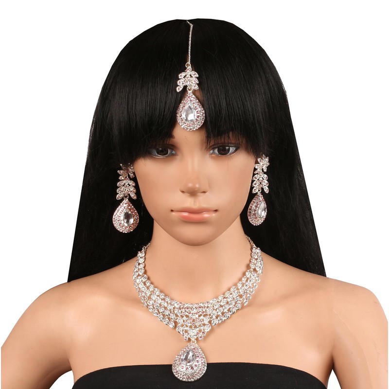 - Touchstone Indian Bollywood Traditional Studded Look White Pink Rhinestone Charming Bridal Designer Jewelry Necklace Set With Mangtika In Silver Tone For Women. EXTRA LONG EARRINGS. Length 2.5 inches EXTRA LONG EARRINGS. Length 2.5 inches SPECIFICATIONS : V shape Necklace. Necklace circumference 8 inches. With adjustable and flexible soft tassel. Earring Weight (single) 21 gms Earring Length 2.50 inches. Earring Width 1 inch.