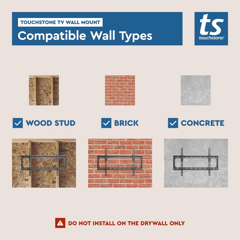 • EASY INSTALLATION: Touchstone’s TV Wall Mount Bracket comes with a user-friendly installation guide and all the necessary hardware. With clear instructions, you can mount your TV quickly and effortlessly, transforming your space in no time. Please note that proper installation requires securing the bracket to wooden studs, brick, or concrete walls. Do not mount to drywall only.ket to wooden studs, brick, or concrete walls. Do not mount to drywall only.