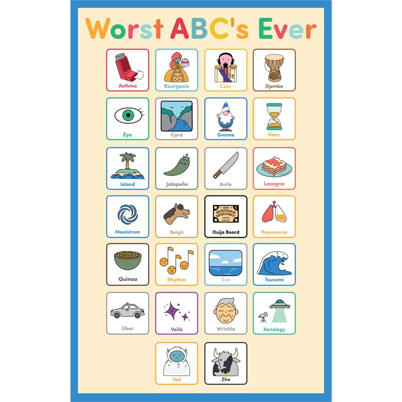 Forget being hooked on phonics, you'll be hooked on how hilarious these terrible phonetics are. I thought I was bad at math, but spelling is H-A-R-D. "H" as in "hour" - "A" as in "Asthma"- "R" as in "Rhythm"-"D" as in "Djembe." Keep this cool poster up on your wall and be prepared for the next time a call center asks you to spell your name. Or give this as a present to the smarty-pants sarcastic teenager in your life.