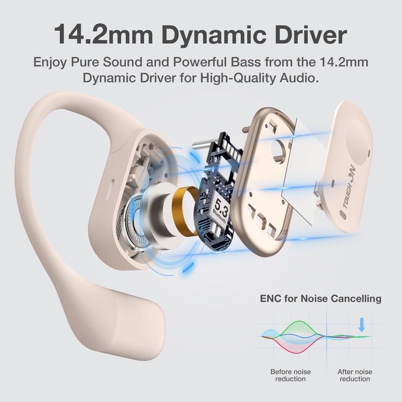 • 【Stronger Bass and Crystal Clear Calls】The TOUGH ON headphones with a 14.2mm dynamic driver, deliver powerful bass and clear treble, enhancing your music-listening experience by bringing every note and detail to life. The open ear earbuds are equipped with ENC noise canceling mics to passively cancel 80% of background noise, allowing you to hear crystal clear calls as if you were communicating face-to-face with others.