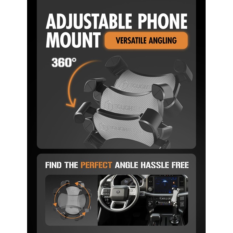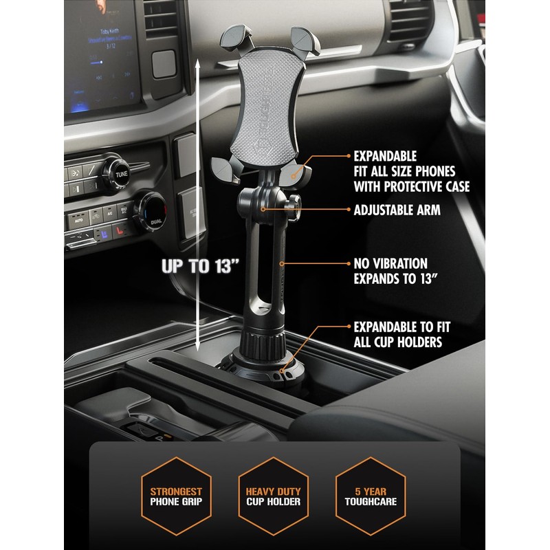 - STURDY & SECURE MOBILE CUP HOLDER MOUNT - Navigate hands-free in a safe, and easy way with ToughTested's Boom Adjustable Mobile Cup Holder Mount. It holds the phone vertically or horizontally while easily absorbing vibrations as you cruise down the road