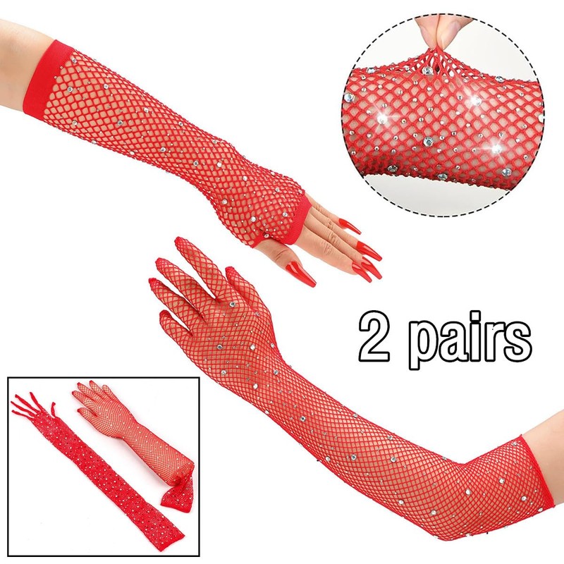 TouKingda Women's Sparkly Mesh Fingerless & Long Fish Net Gloves, 2 Pairs - Red