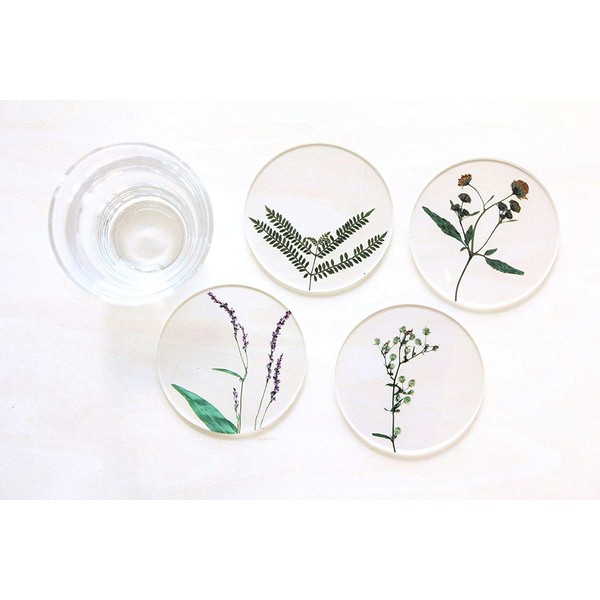 toumei Tomei Pressed Flower Coasters Set of 4 in Wooden Box is a stylish set of acrylic plastic botanical art.