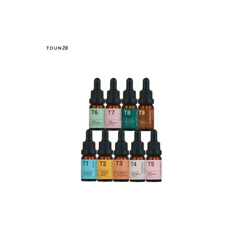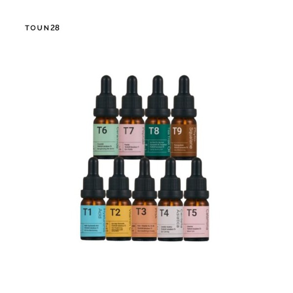 TOUN28 Solutions 10ml A collection of nourishing essence features different formula for solving different types of skin problems. T1 Hyaluronic Acid: Formulated with 5-Multi Hyaluronic Acid that provides oil-free and deep hydration to the skin. T2 Vitamin C: Contains 100,000ppm of Vitamin C that helps brighten up the skin tone. T3 PHA: Consists of PHA, Banana Flower Vinegar and various Vitamins that rejuvenate the skin and keep your skin smooth. T4 Centella Asiatica: Features Centella Asiatica extract that helps soothe sensitive skin from irritation. T5 Calamine: Formulated with Calamine that absorbs the excessive sebum and keeps the skin refreshing. T6 Ceramide: Contains 5-Complex Ceramide that helps strengthen the skin barrier for healthier skin. T7 Peptide: Consists of Peptide that nourishes and revitalizes the skin. T8 Tea Tree Oil: Contains 100% Tea Tree Oil that soothes sensitive skin and keeps your skin clean and healthy. T9 Phyto-Squalane: Formulated with 100% Plant Squalane Oil that helps for a skin protection barrier and keeps your skin hydrated. How to Use Take a moderate amount and apply gently over the face, pat lightly for better absorption. Ingredients Water, Glycerin, Hyaluronic Aci, Sodium Hyaluronate, Potassium Hyaluronate, etc. #TOUN28_Solutions_10ml,#TOUN28,#Solutions,#Ampoule,#TOUN28_Ampoule,#T1_Hyaluronic_Acid,#T2_Vitamin_C,#T3_PHA,#T4_Centella_Asiatica,#T5_Calamine,#T6_Ceramide,#T7_Peptide,#T8_Tea_Tree_Oil,#T9_Phyto_Squalane