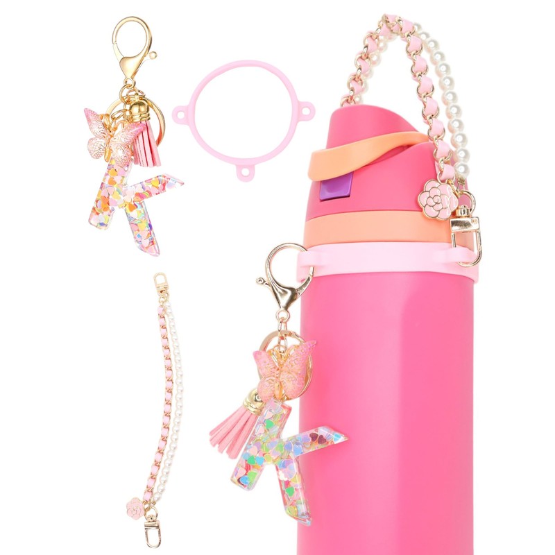 TOVICE Letter Charm Accessories for Owala Water Bottle 24-40oz, 3PC Cute Initial Charms & Water Bottle Handle Strap with a Thick Elastic Silicone Ring Holder (Pink, K)