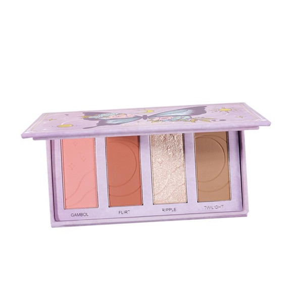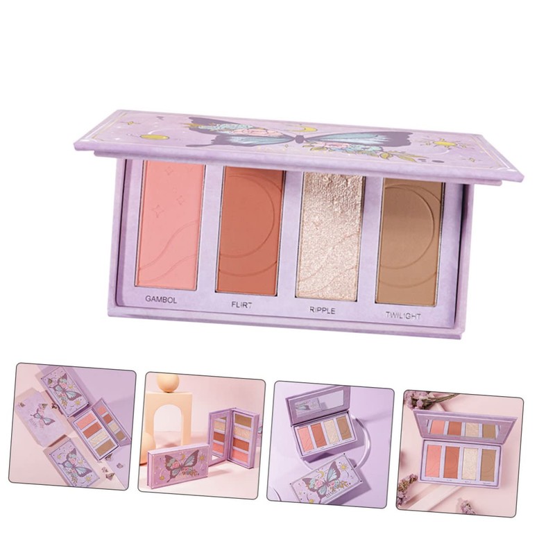 -A four-pan makeup pallet with blush, highlight, and face shades pallet.