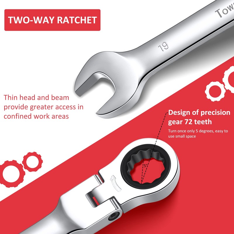 • 【180°Flex-head Ratchet Head】180 degree flex head helps you to reach the awkward places where most ratchet wrenches would not reach. The 72-teeth ratchet gears need only a 5-degree working swing arc suitable for any narrow space.