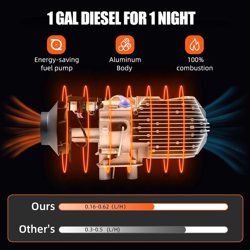 - [ Low Energy Consumption ] Our diesel heater's precision low-noise fuel pump saves on fuel costs, consuming less than 1 gallon per night. Fuel consumption: 0.16-0.5 L/h (0.04-0.13 gal/hr). Maximizing fuel performance and reducing energy waste