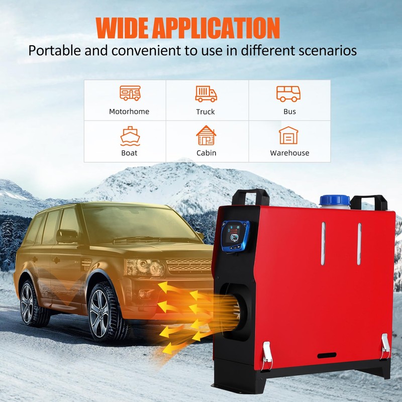 - [ Wide Application ] The portable diesel heater can be used for heating the cabins of various mechanical vehicles, including cars, lorries, RVs, trucks, caravans, engineering vehicles, boats, touring cars, garages, and more. It can also be used for home heating via a 12V DC adapter. Applicable Range: 215-269ft²/20-25m²