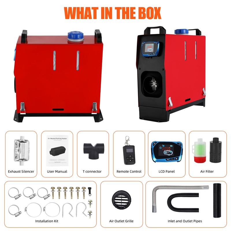 - [ LCD Display & Remote Control ] This diesel car parking heater has a smart LCD display and remote control. With the equipped remote control, you can remotely change the temperature and timing to heat the car before entering the car (32 ft). And the large LCD allows you to understand and adjust the status of the heater clearly