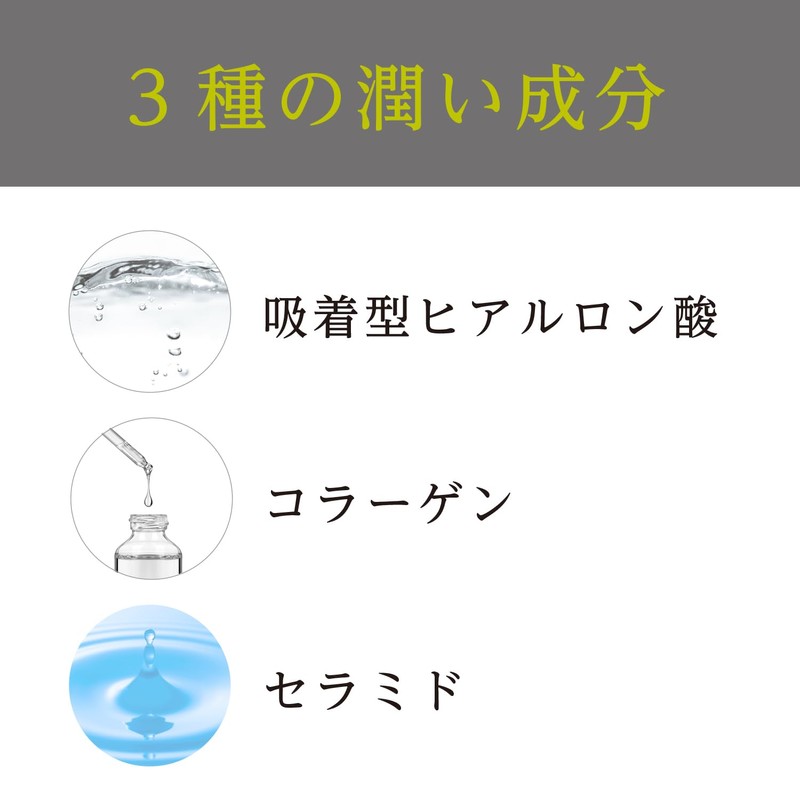 - (3 Types of Moisturizing Ingredients and Skin Supporting Ingredients) Contains adsorptive hyaluronic acid, collagen, and ceramide as a moisturizing ingredient. The skin supplementary ingredients are formulated with domestically grown dokudami extract, aloe extract, and yuzu extract to keep your skin beautiful