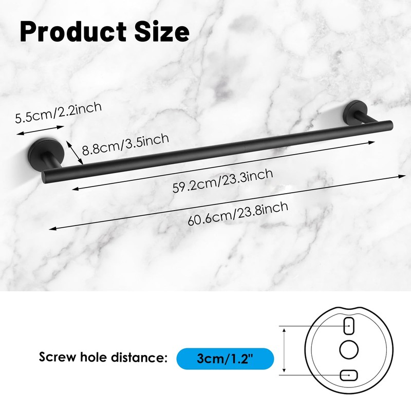 - 23.3 Inch Usable Length Bathroom Towel Rack - The total length of towel bars for bathroom is 23.8 inches/60.6cm, and the hanging length is 23.3 inches/59.2cm. It can hang a large towel or two folded hand towels, so bathroom towel bar is a great helper for saving space. The distance from the bracket of black hand towel holder to the wall is 3.5 inches/8.8cm, with sufficient reserved space to ensure air circulation and quick drying of wet towels.