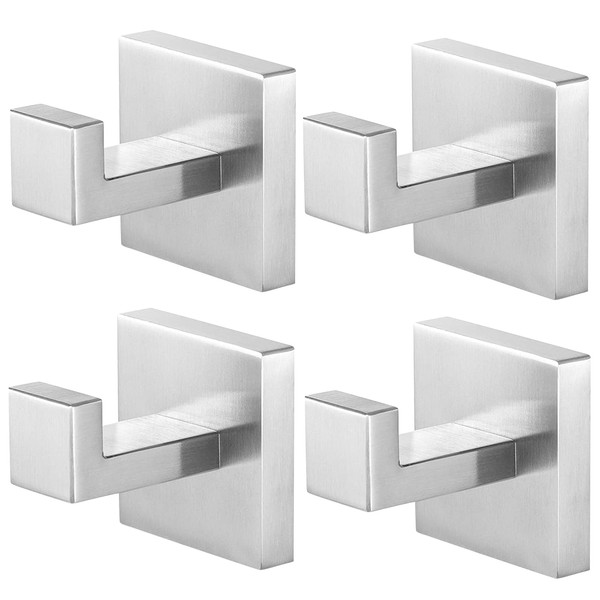Towel Hooks,SUS304 Stainless Steel Towel Hook Anti-Rust,4 Pack Modern Matte Silver Hooks for Hanging,Heavy Duty Square Hooks,Easy Installation Bathroom Hooks,Silver Hooks for Bathroom/Kitchen