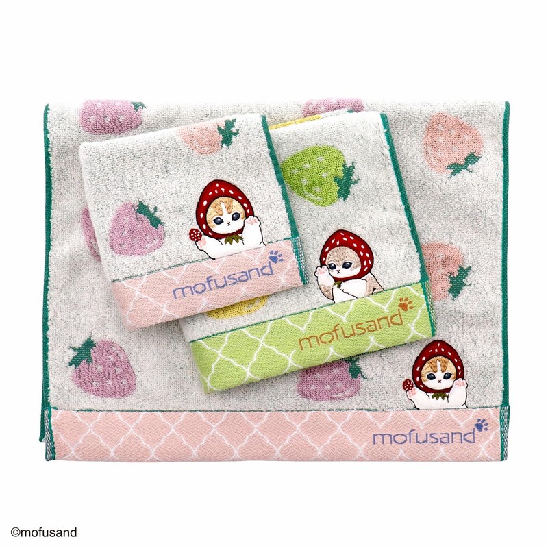 Towel Museum mofusand Strawberry Wash Towel with Loop, Pink, Cat, Cute, 43-0141080, Approx. 13.4 x 13.8 inches (34 x 35 cm)