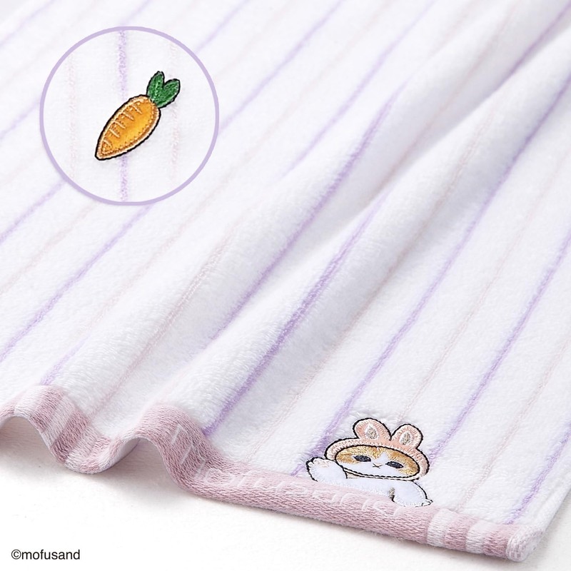 Towel Museum mofusand Striped Towel Handkerchief, Purple, Rabbit Cat Cute, 43-007070, Approx. 9.8 x 9.8 inches (25 x 25 cm)
