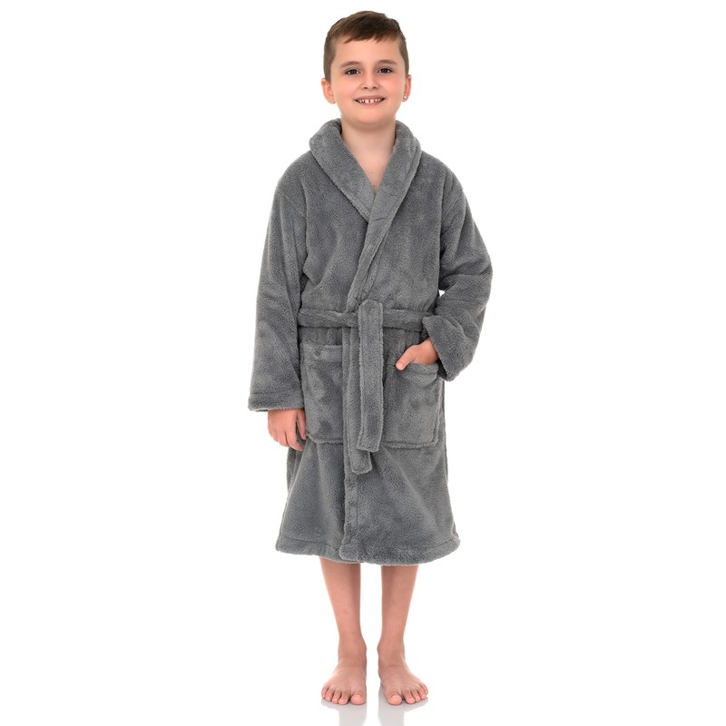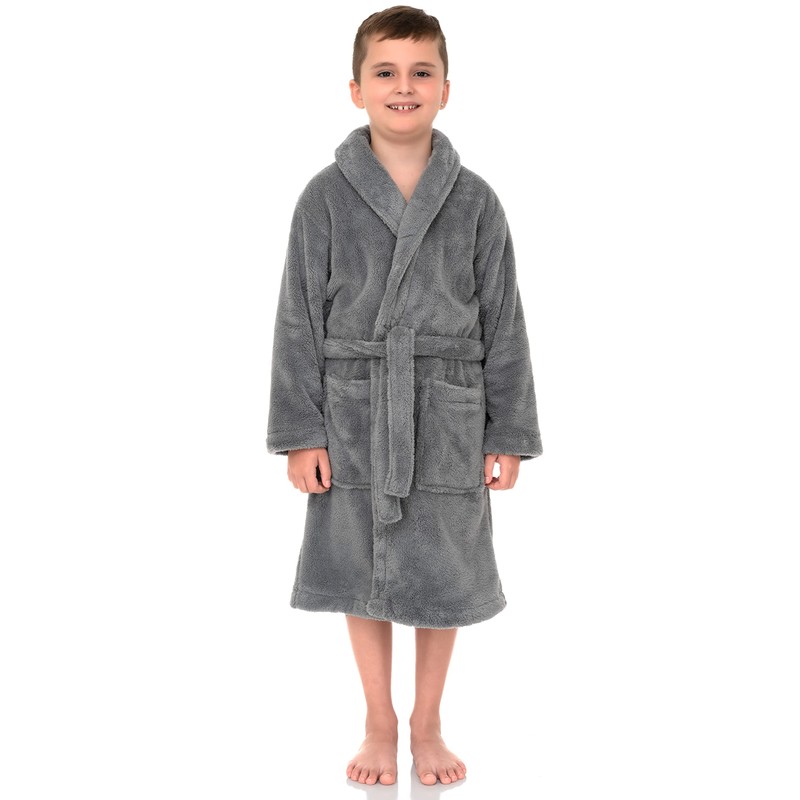 - Shawl Fleece Robe - Shawl collar super plush kids robe is extremely soft, warm and comfortable. This lightweight boys' bathrobe is perfect for all day long. It is double stitched for durability. Great for bath, pool and beach. The super plush boys' robe comes in several kid-friendly colors. It features a removable belt and two front pockets for your child's convenience.
