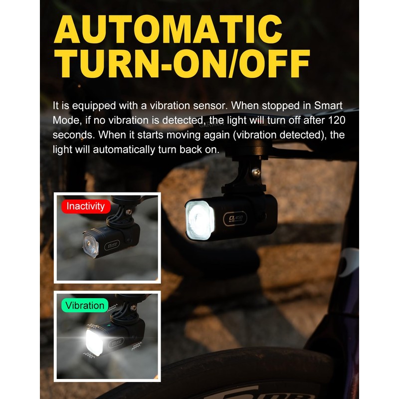 • Water Resistance: The CL450 road bike light is rated at IPX6 for water resistance, making it suitable for use in various weather conditions, including rain and splashes. This durability ensures that the light remains functional and reliable, even in wet environments.