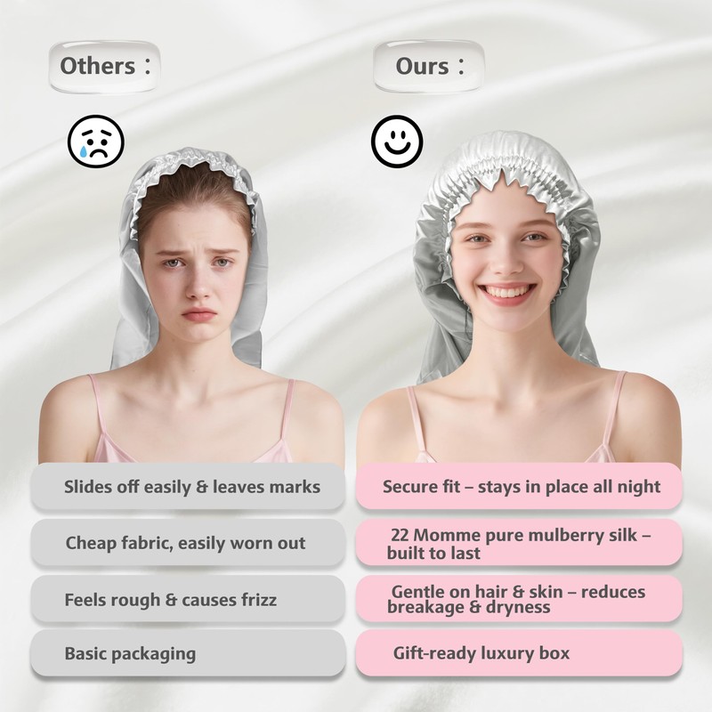 • Innovative design - Developed from the experience of numerous customers: Our designers have listened to feedback from real users and carefully designed a new, elongated silk sleep cap. The elastic opening ensures a comfortable fit without pressure points - no slipping, no pulling, no squeezing. The design reduces friction, hair breakage and frizz, gently protects hair and scalp and improves hair structure and sleep quality in the long term