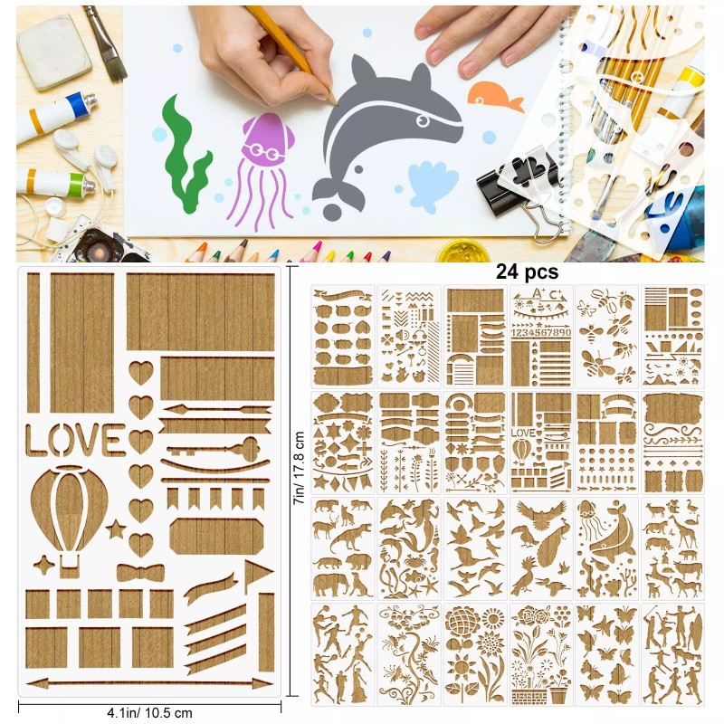 TOWOM Artistic Creations: 24-Piece Mixed Shapes Drawing Stencils Kit - Animal, Flower,