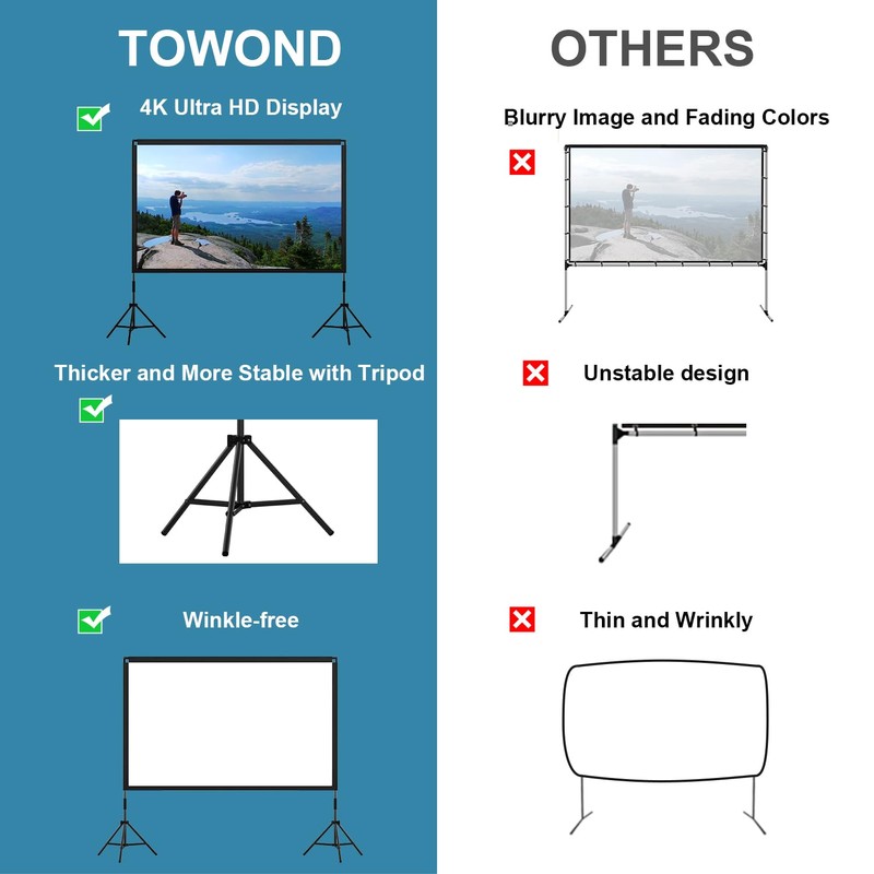 TOWOND Projector Screen and Stand, Towond 120 inch Portable Movie Screen Indoor Outdoor 16:9 4K HD Front Rear Projection Screen with Carry Bag Wrinkle-Free and Foldable Design for Home Theater