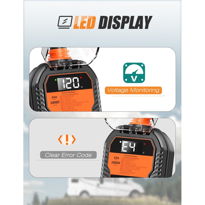 - CLEAR LED DISPLAY: Featuring a bright LED display, our 50 Amp RV surge protector provides real-time voltage readings and user-friendly error codes. Unlike basic LED indicators, the clear error codes make it easy to identify and resolve issues quickly