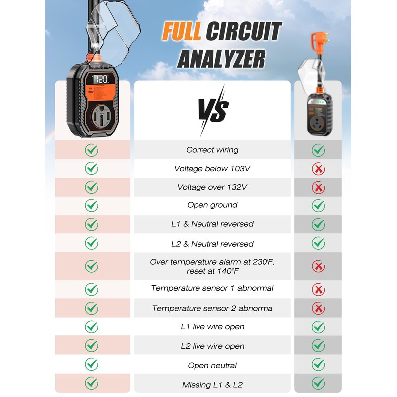 - COMPREHENSIVE DETECTION: Our 50 Amp surge protector for RV detects wiring faults like open ground and reverse polarity, as well as voltage and temperature. This helps you assess power quality before connecting your RV, ensuring proper wiring and identifying potential issues
