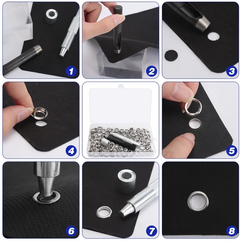 - Easy to use: First punch holes in the fabric with a black hole punch, insert the eyelets into the holes and place the seal over the installed eyelets. 4. Place the ring eyelets flat on the floor and then place the silver mounting tool vertically and hammer in.